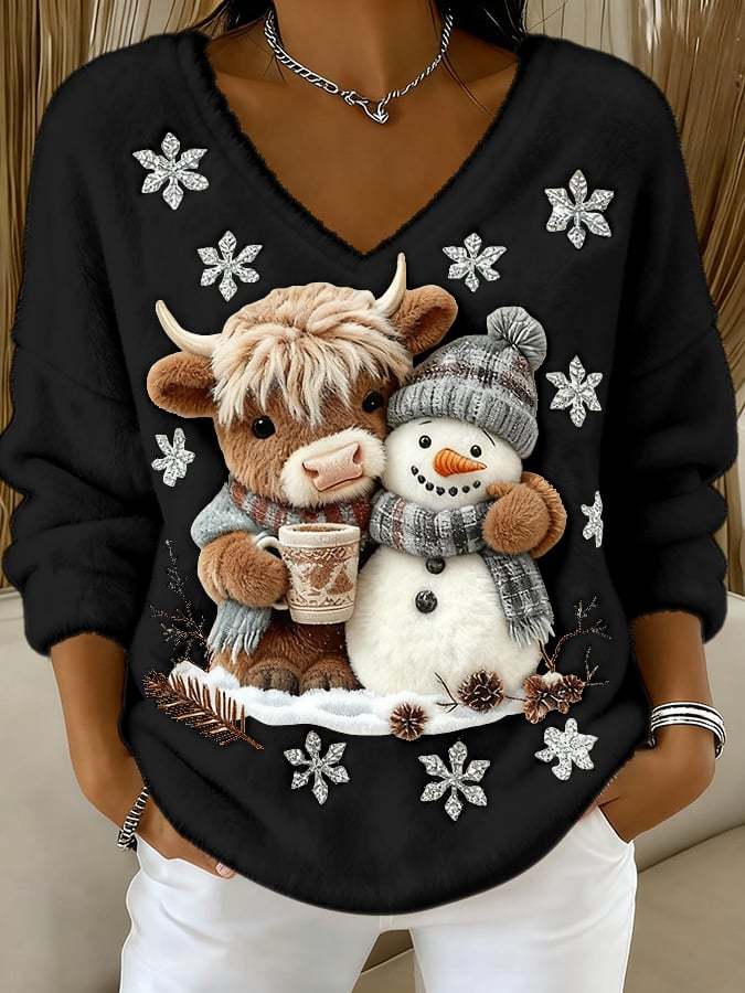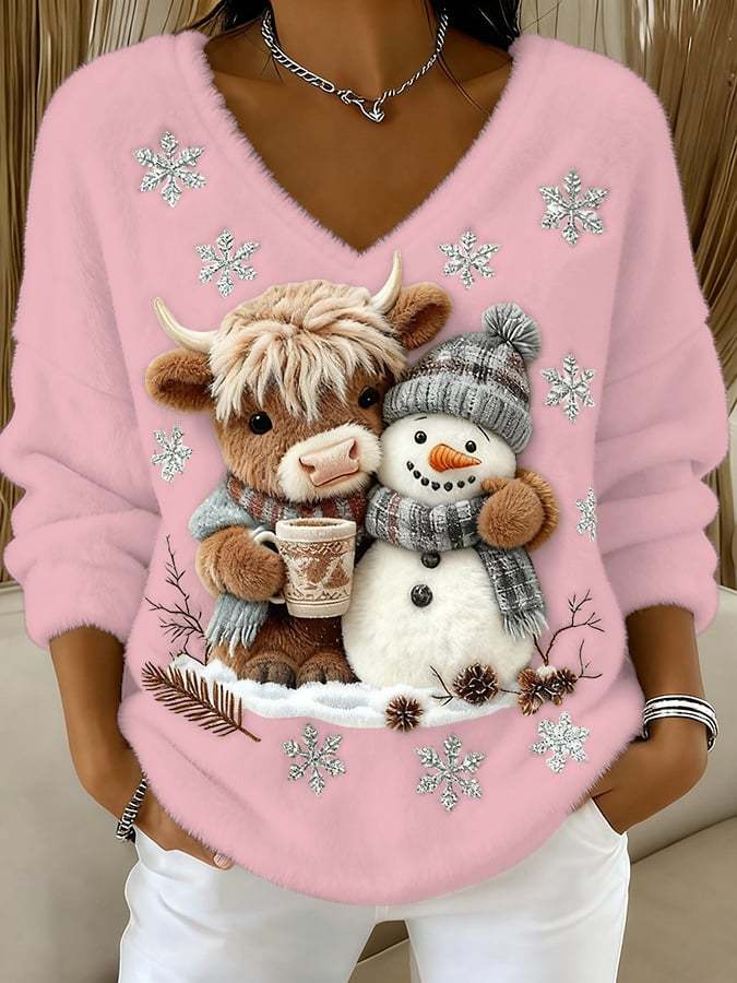 🔥Last Day 49% OFF🔥Women's Animal Highland Cow Yeti Art Print V-Neck Top